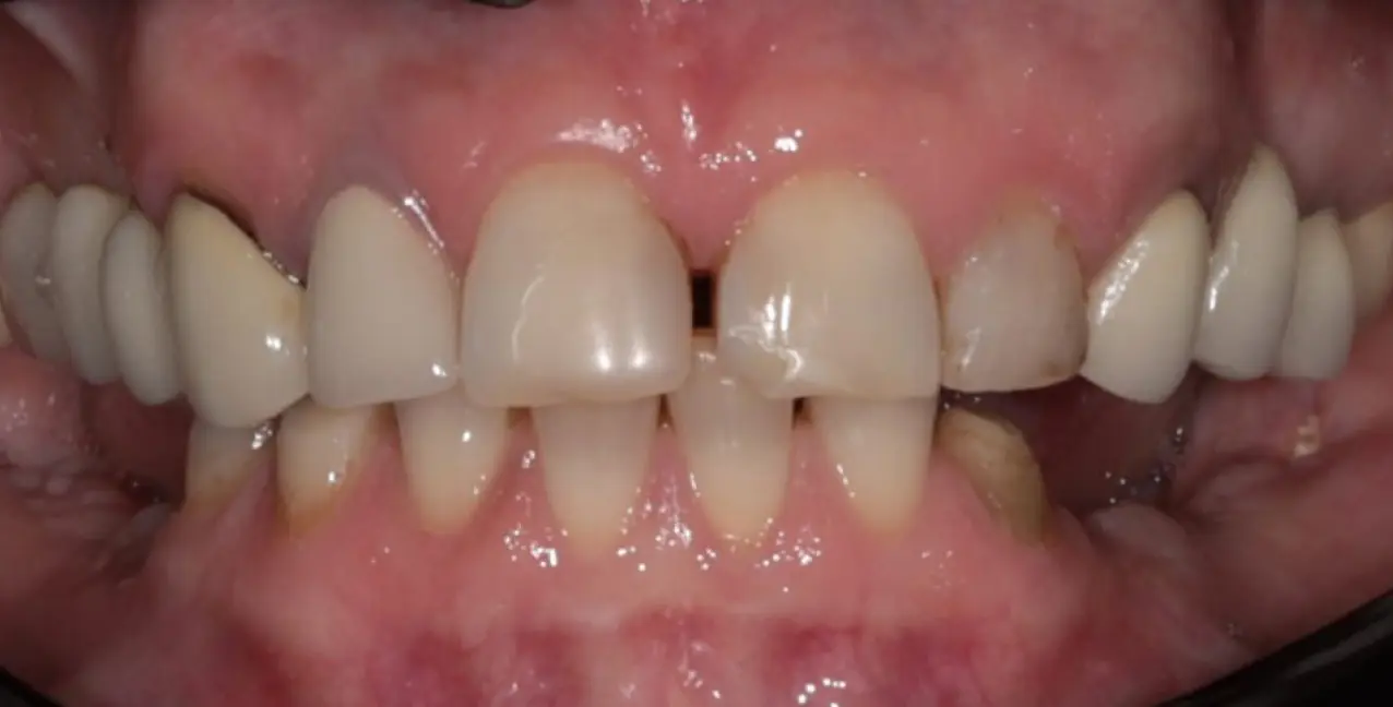- має сколи, тріщини, потемніння емалі або щілини між зубами;